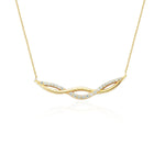 Denne smukke halskæde har et elegant, bølgende design i "blankt guld" , hvor to fine buer fletter sig sammen. Den ene bue er besat med funklende klare sten, som giver et eksklusivt og feminint udtryk. Et tidløst smykke, der balancerer enkelhed og luksus på den mest sofistikerede måde.