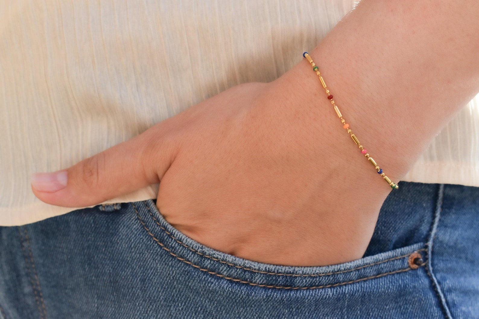 Dette elegante armbånd er designet med fine gyldne detaljer kombineret med små farverige perler, som giver et let, feminint og sommerligt udtryk. De diskrete farver skaber et smukt spil langs armbåndet og gør det nemt at style – både alene for et enkelt look eller sammen med andre armbånd for et personligt lag-på-lag udtryk.