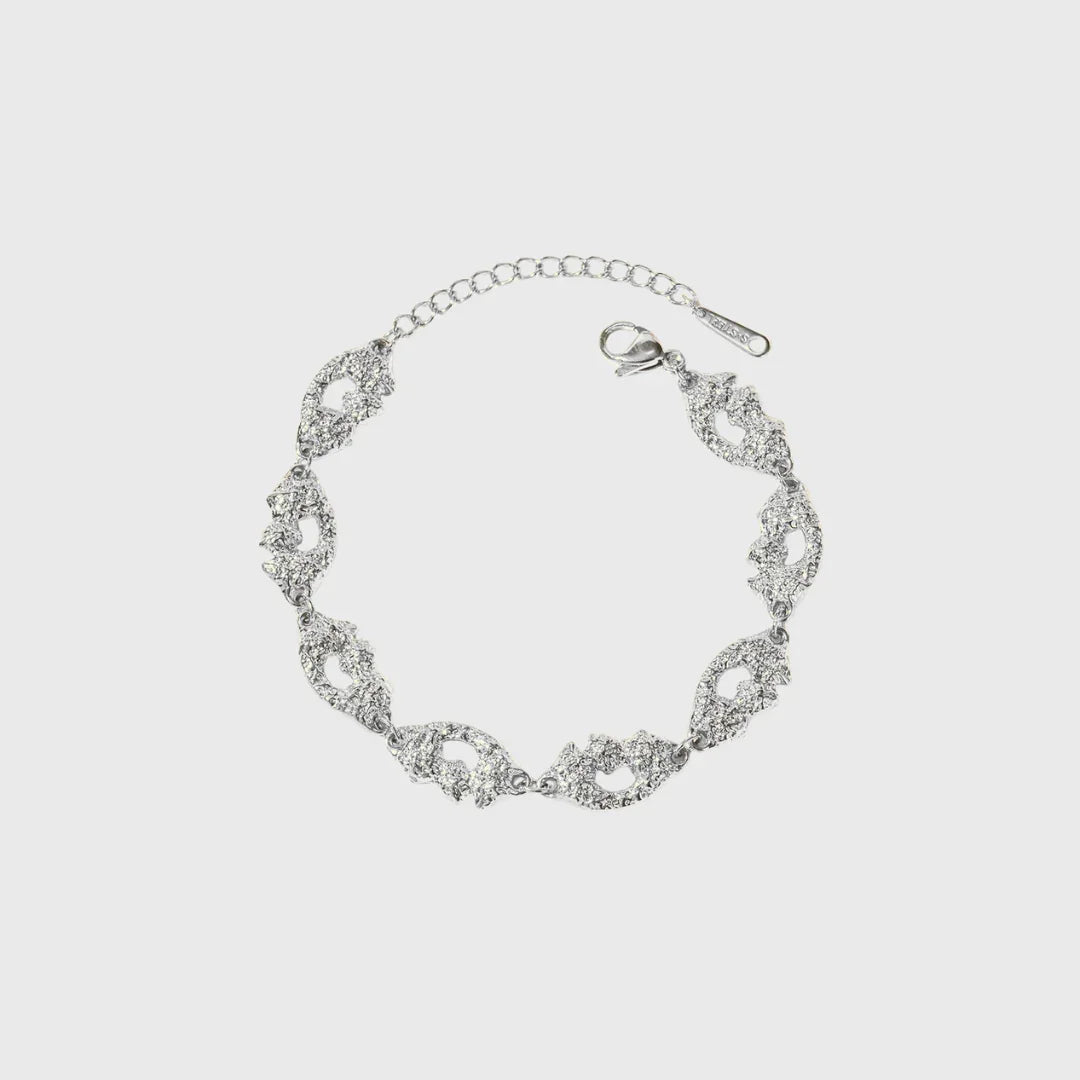 Dette elegante armbånd kombinerer rå struktur med et feminint og eksklusivt udtryk. De detaljerede, organiske led skaber et unikt spil i overfladen, som fanger lyset smukt og giver armbåndet et luksuriøst look.