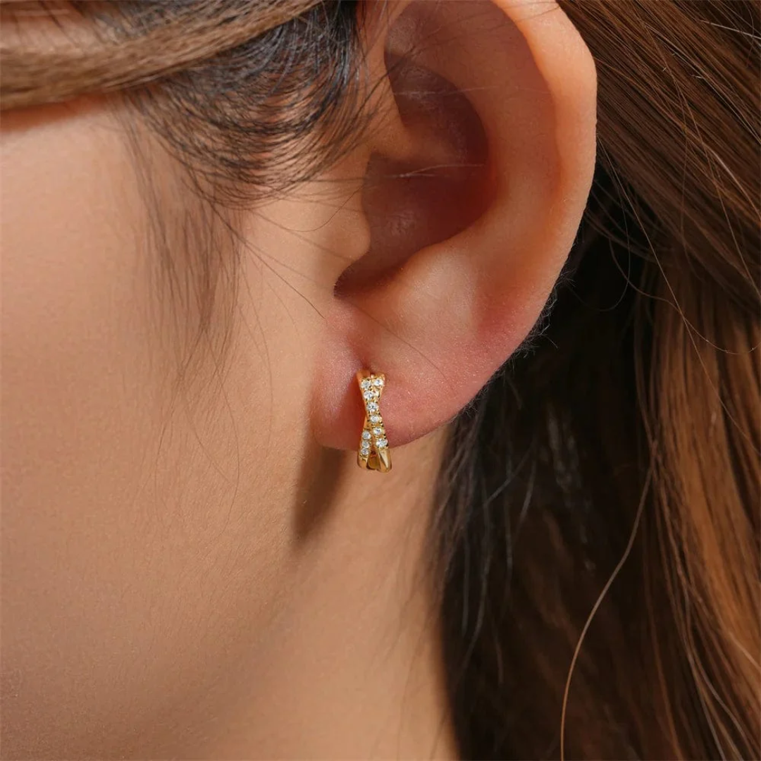 Beskrivelse: Vera øreringe er snoet og iøjefaldende, prydet med smukke hvide krystaller, der tilføjer et strejf af glamour. Deres design kombinerer moderne stil med tidløs finesse, hvilket gør dem ideelle til både festlige lejligheder og hverdagsbrug.