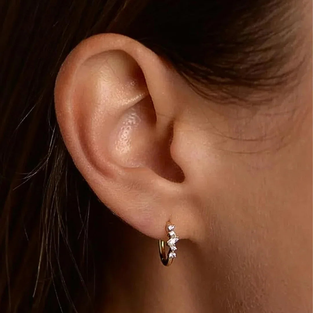 Beskrivelse: Alexa øreringe er smukke og iøjefaldende, prydet med 5 smukke hvide krystaller, der tilføjer et strejf af glamour. Deres design kombinerer moderne stil med tidløs finesse, hvilket gør dem ideelle til både festlige lejligheder og hverdagsbrug.