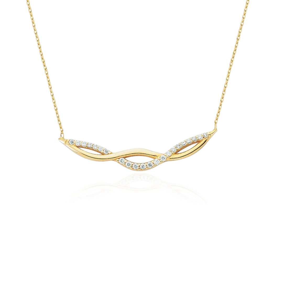 Denne smukke halskæde har et elegant, bølgende design i "blankt guld" , hvor to fine buer fletter sig sammen. Den ene bue er besat med funklende klare sten, som giver et eksklusivt og feminint udtryk. Et tidløst smykke, der balancerer enkelhed og luksus på den mest sofistikerede måde.