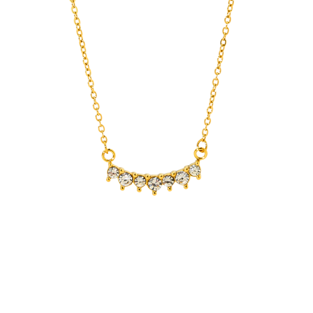 Denne fine halskæde er designet med en smuk, let buet række af funklende krystaller, der giver et eksklusivt og feminint udtryk. De klare sten er nænsomt indfattet i en gylden fatning, som smukt fanger lyset og skaber et elegant shine – både til hverdag og særlige anledninger.